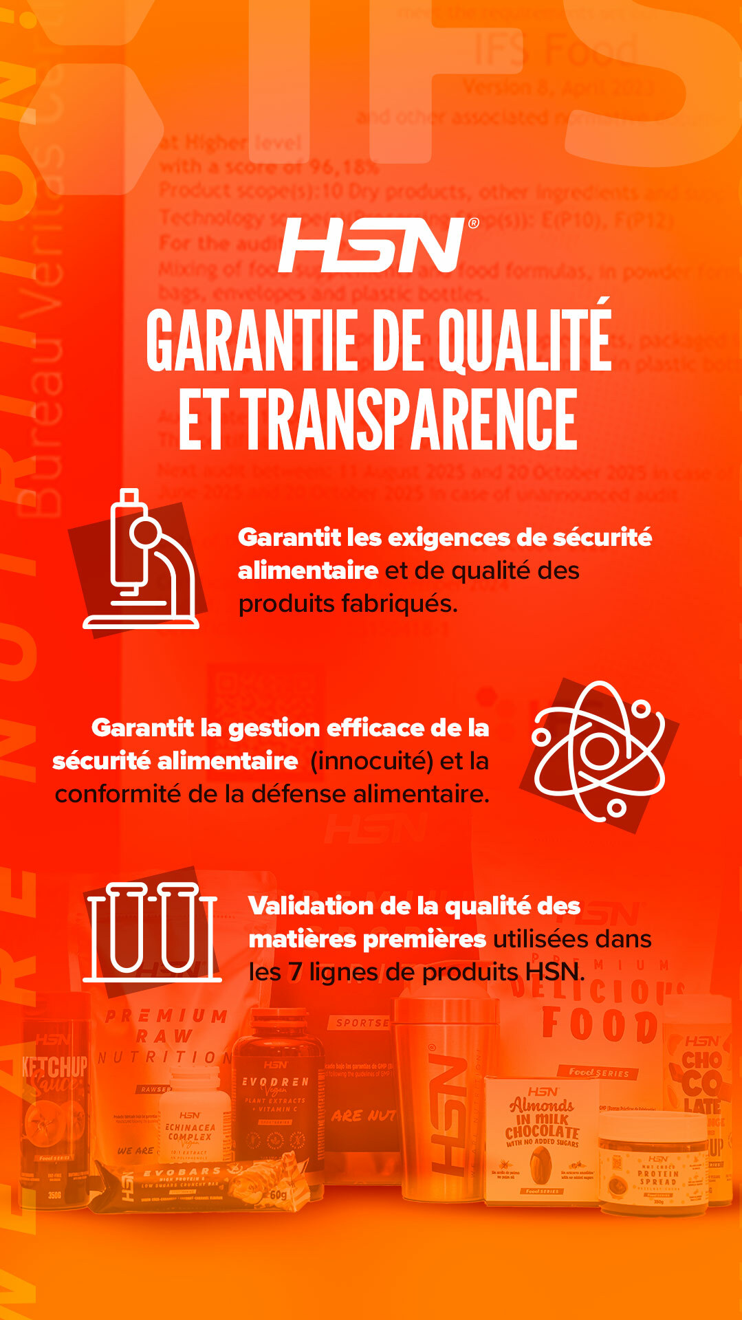 L’IFS Food renforce l’engagement envers la sécurité et la qualité de tous ses produits, un principe que nous défendons depuis nos débuts chez HSN. Cette certification reconnaît notre excellence dans le domaine d’action de notre usine, qui couvre les aspects suivants :