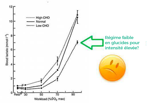 Comme on peut le voir dans le graphique ci-dessus, un régime pauvre en glucides réduit fortement la production de lactate