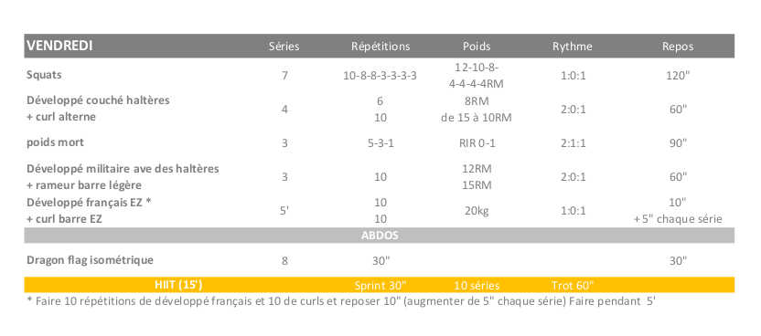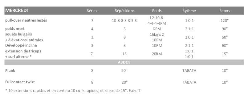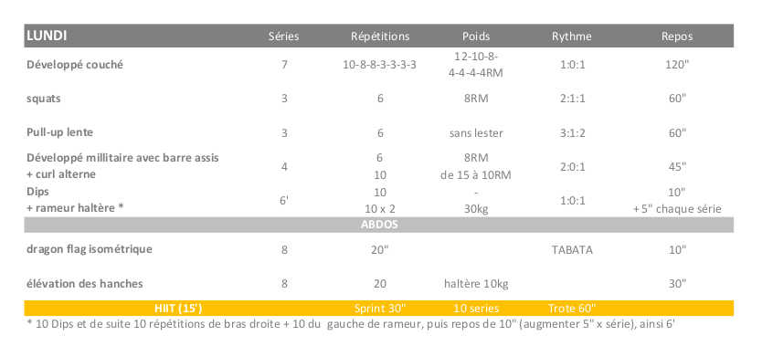 On retourne au planning de la routine à fréquence élevée de 3 jours de fullbody (peut-être je modifie les jours d’entraînements, mais je doit toujours avoir un jour de repos entre les entraînements).