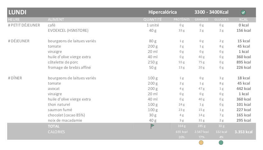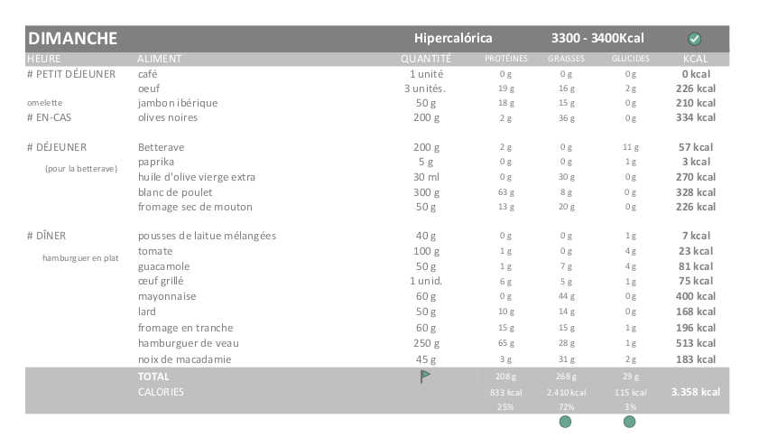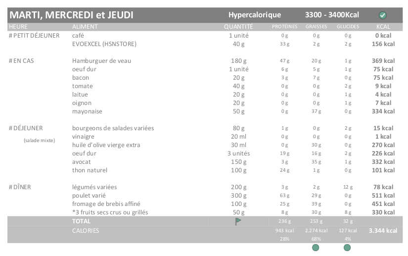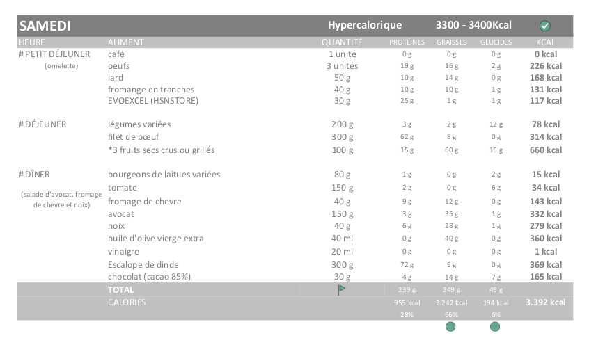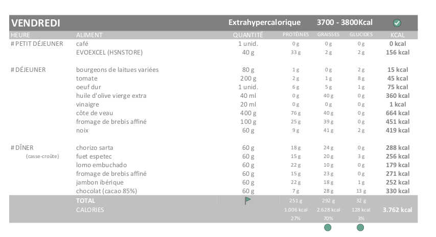 Donc, pour ne pas gagner trop en graisse, je vais faire un régime strictement Hypercalorique (115% / 3.300-3.400 kcal, à l’exception d’un jour à la semaine (le vendredi) qui continue à être EXTRA Hypercalorique (130% / de 3.700 – 3.800 kcal).