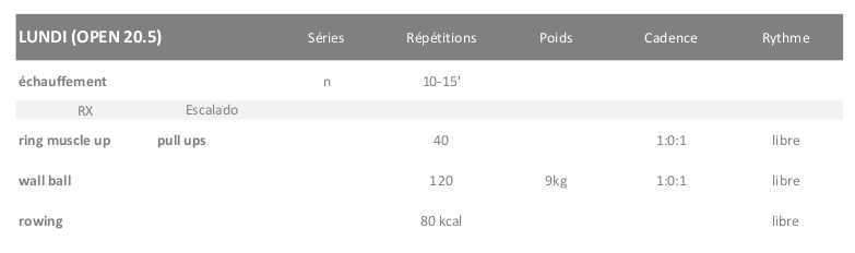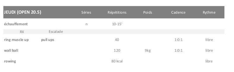 Le niveau d’intensité je crois qui va augmenter au maximum, car je ne suis pas habitué à faire du WOD, et qu’a cause de mon petit problème cardiaque, toujours sous étude, mon nivau cardiovasculaire n’est pas si bonne comme j’aimerai.. La voici :