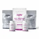 Pack pour sportifs vegan qui réunit créatine monohydrate 500 g, bêta-alanine 150 g, vitamine B12 (cyanocobalamine) 1000 mcg, protéine de soja isolée 500 g et extrait de thé vert 25:1 en gélules végétales.