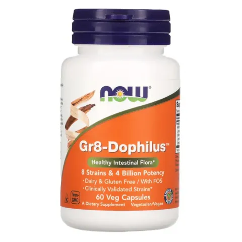 Gr8-Dophilus de Now Foods est un complément alimentaire à base de souches de bactéries lactiques en gélules végétales.