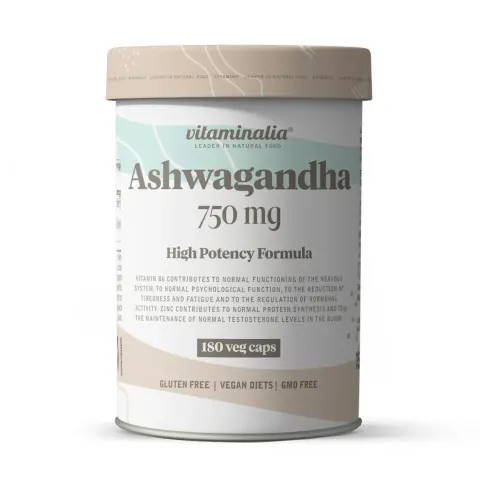 Ashwagandha 750mg de Vitaminalia est un complément alimentaire en gélules végétales, à base d'extrait de racine de Withania somnifera, avec de la vitamine B6 et du Zinc.